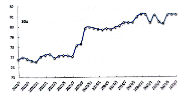 經(jīng)調(diào)整,7月份產(chǎn)量為376.4萬噸;預(yù)計8月份產(chǎn)量為376.5萬噸,同比增長1.2%,環(huán)比基本持平。